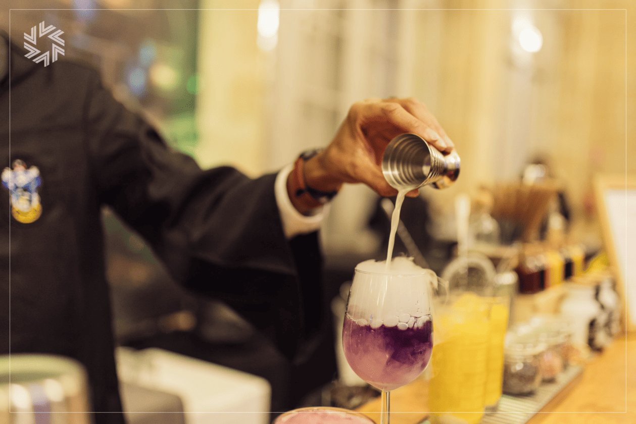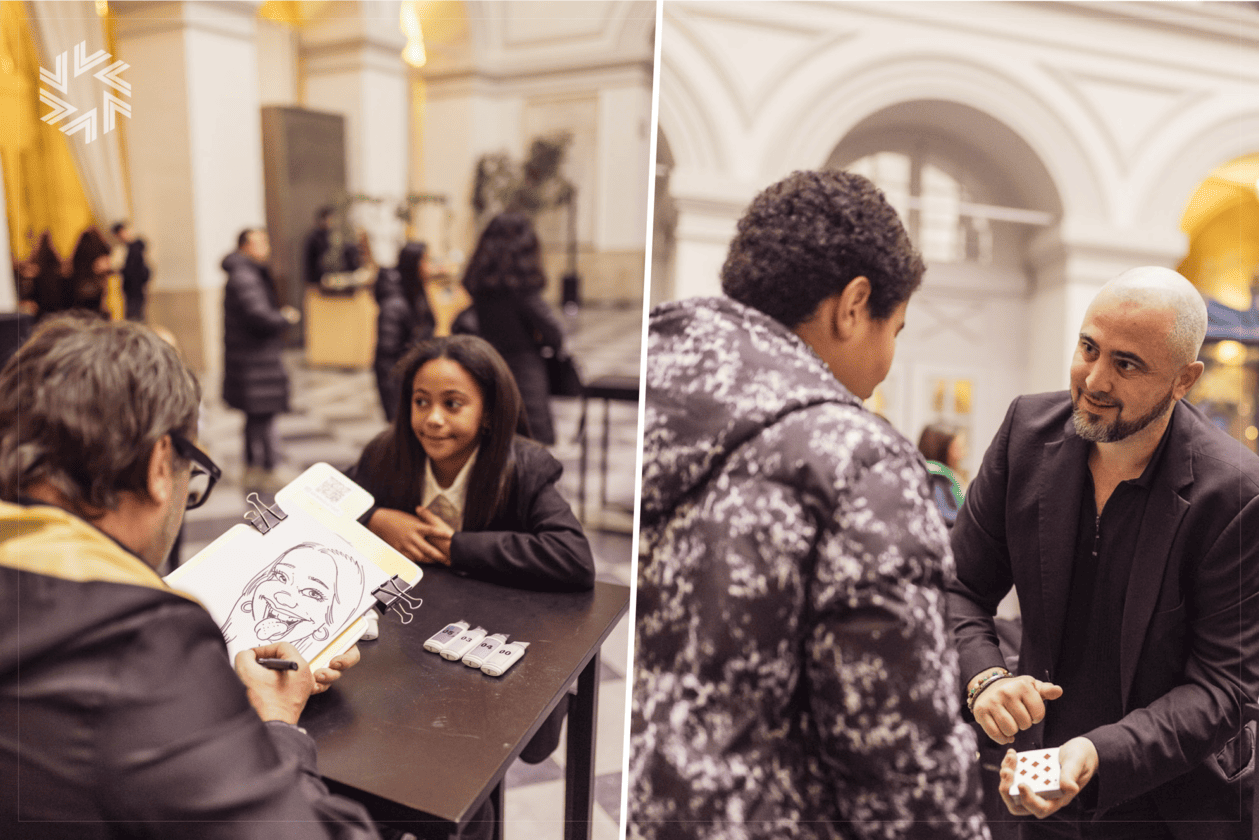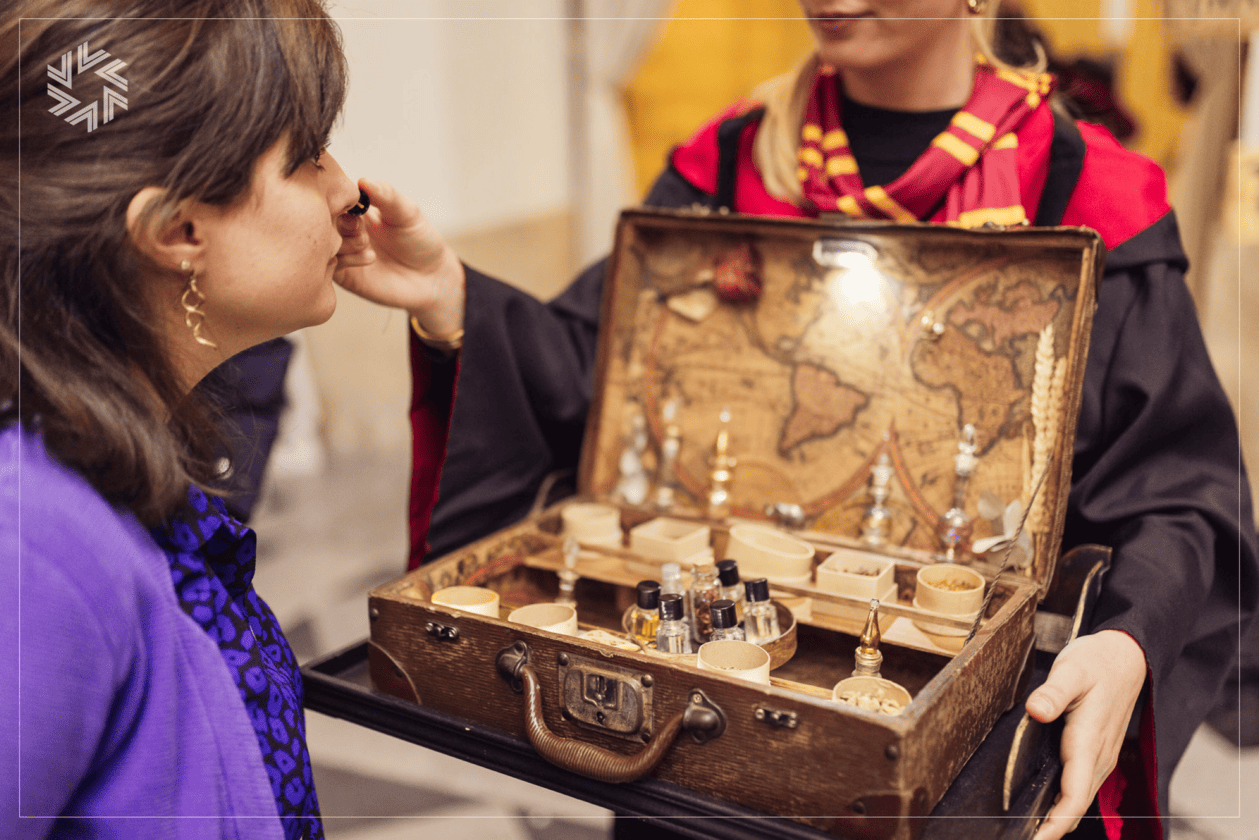 Dès leur arrivée, les invités empruntaient la mythique voie 9 ¾, avant de pénétrer dans la grande salle du Palais de la Bourse, magnifiquement scénographiée pour évoquer les décors emblématiques de la saga. Sous les verrières illuminées, une profusion d’animations thématiques a transporté petits et grands : bar à potions, challenge de Quidditch, ateliers de baguettes magiques, photobooth sorcier, stands de barbe à papa magique et dégustations ensorcelées. Chaque espace proposait une expérience immersive, ludique et participative.
