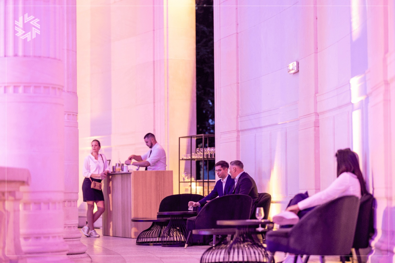 Le décor a joué un rôle clé : un mobilier sur-mesure, conçu et installé par nos soins, a transformé les espaces du Palais en un lieu chaleureux et immersif, favorisant confort et échanges. Au cœur de la soirée, un bar à cocktails a animé les convives avec une carte créative et raffinée, offrant une expérience gustative à la hauteur du lieu.